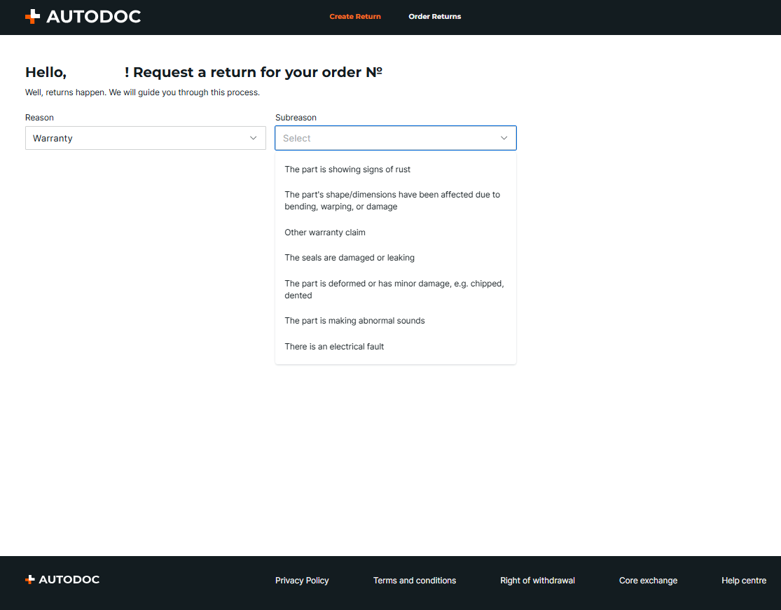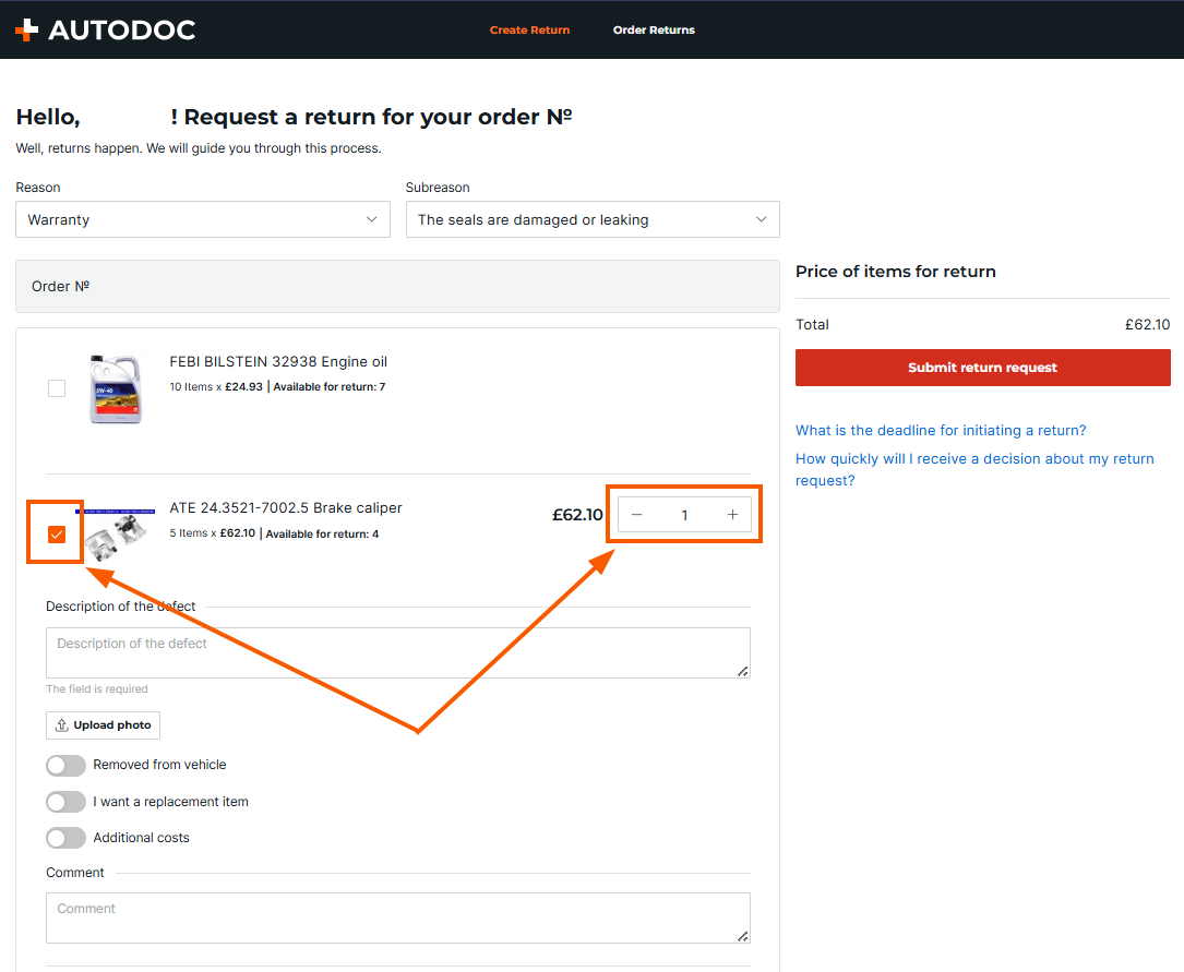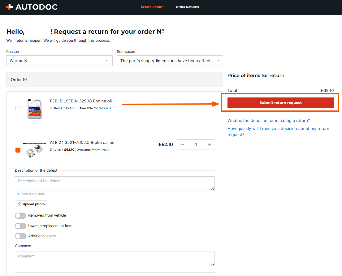 - Click on Submit return request to have the warranty claim sent to us for review.