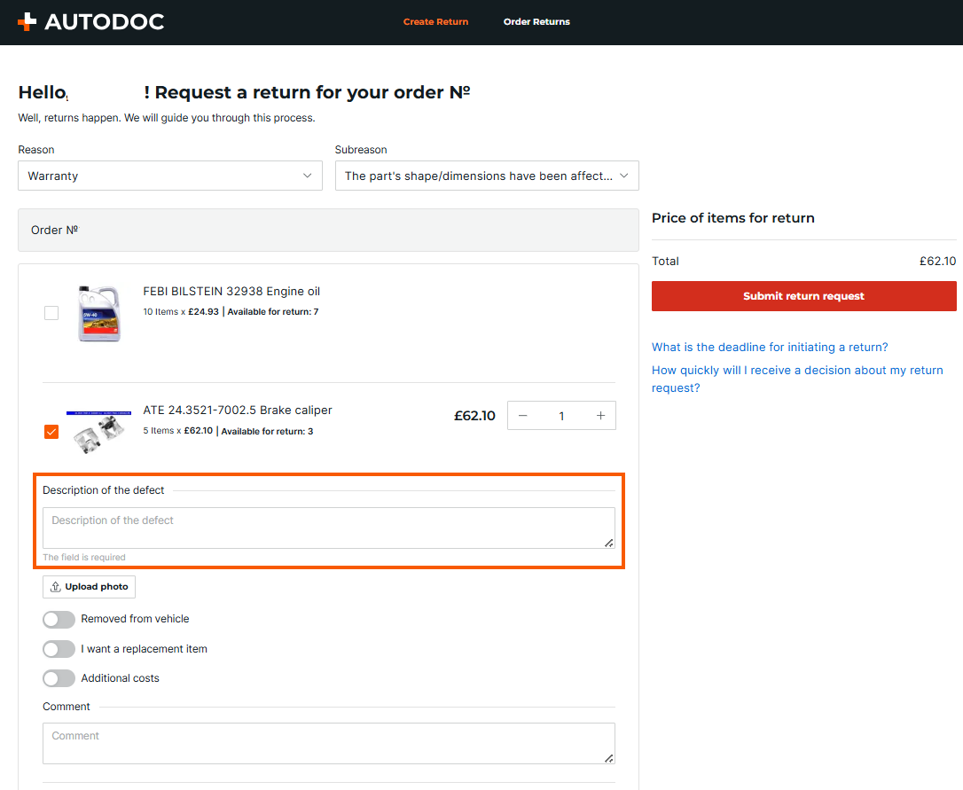 - Next, you need to describe the product defect in the mandatory Description of the defect field.