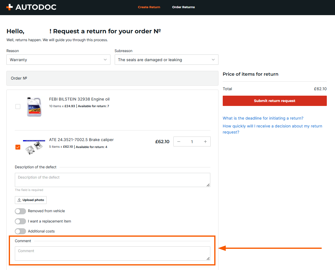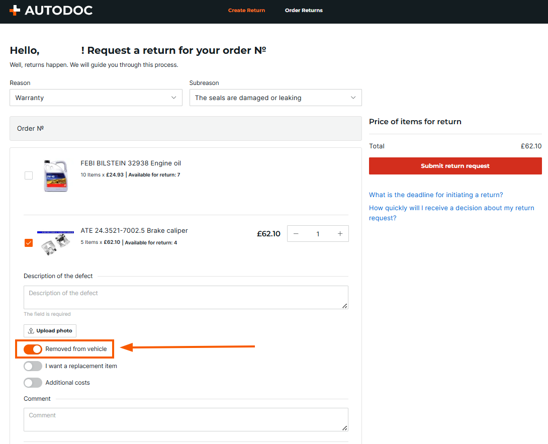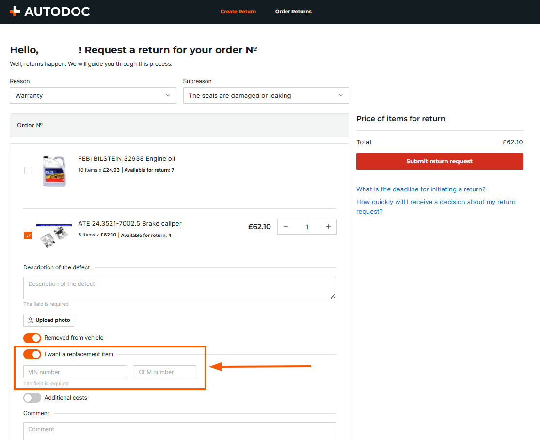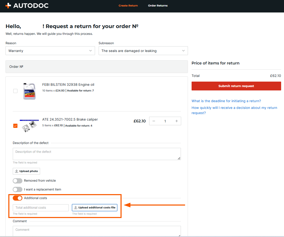 Please note:If a replacement is needed, the VIN and/or OEM number of the part must be provided. - Indicate whether you have incurred additional costs due to a product defect. The Additional costs toggle turns orange when activated to indicate that there are additional costs.