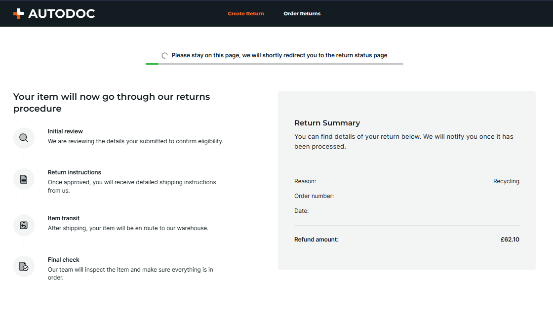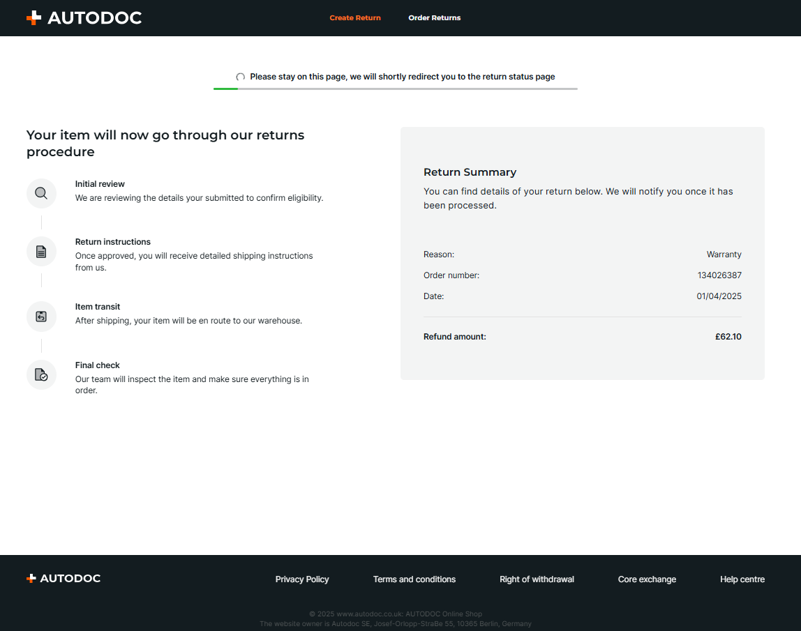 - Click on the Submit return request button. The request will then be sent to us for review.