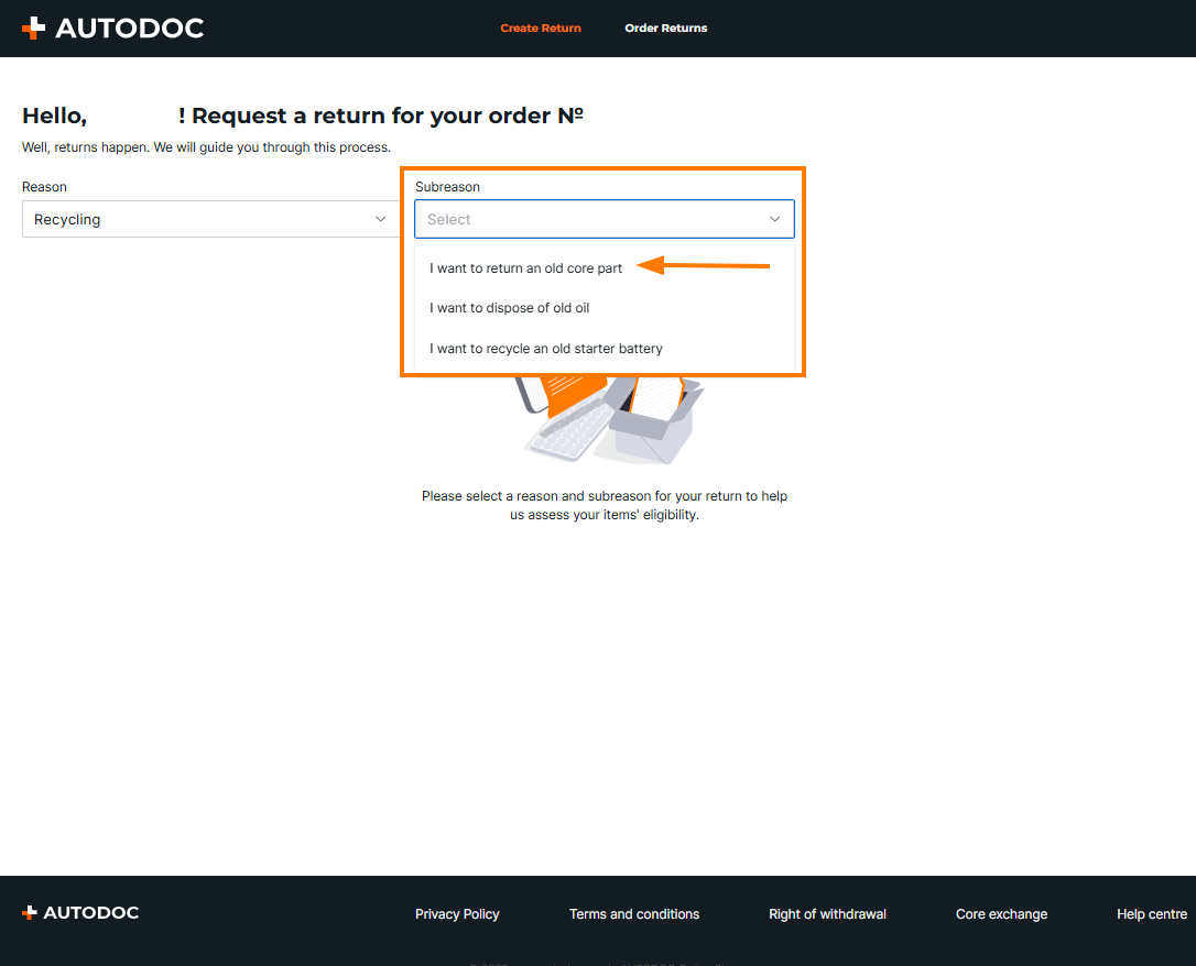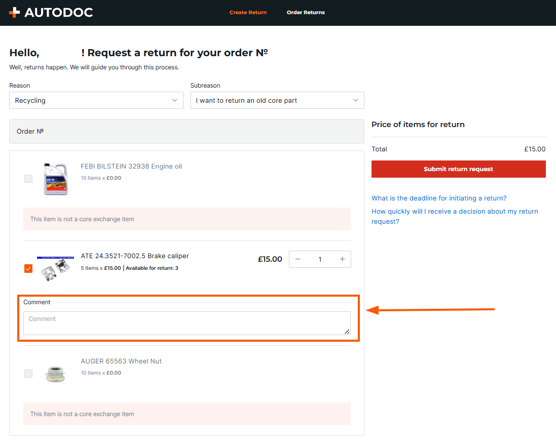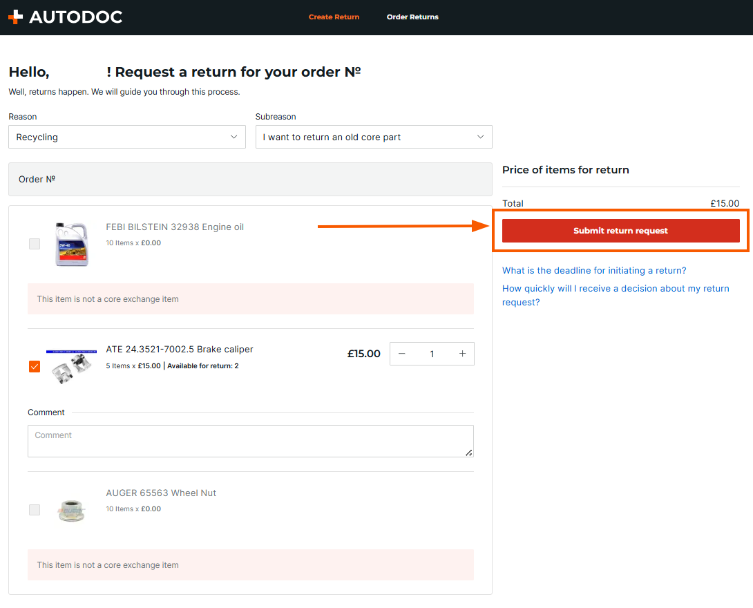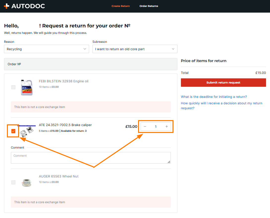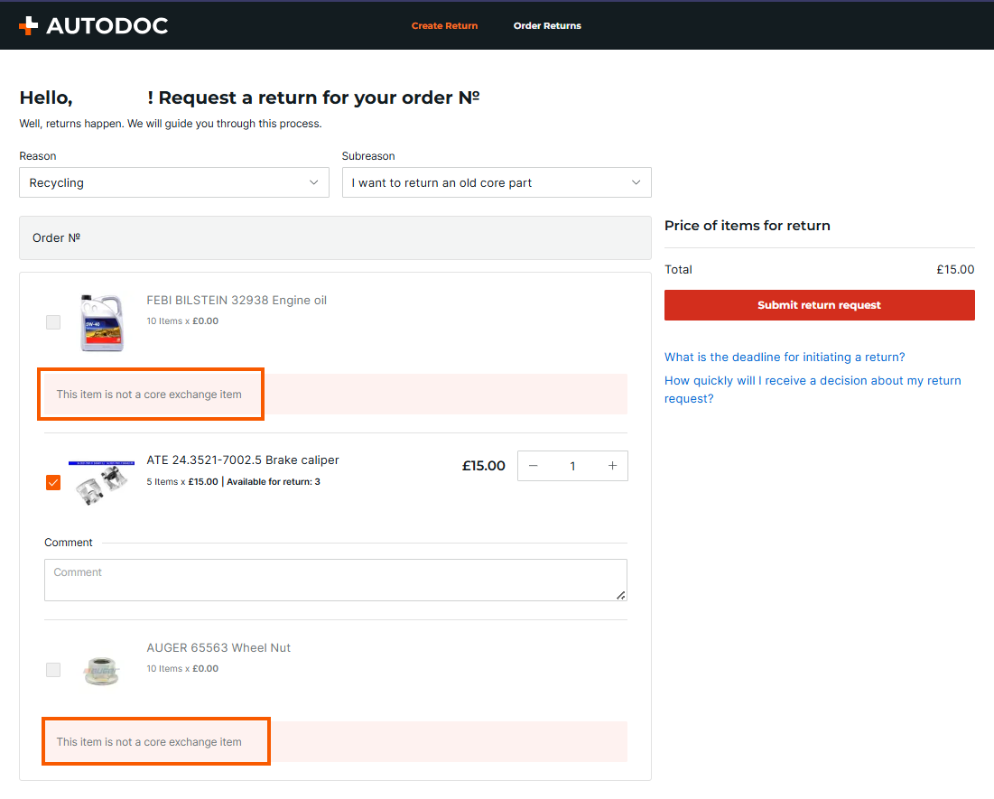- Please note: if there are items in the order that are not returnable under I want to return an old core part, they will be labelled This item is not a core exchange item.