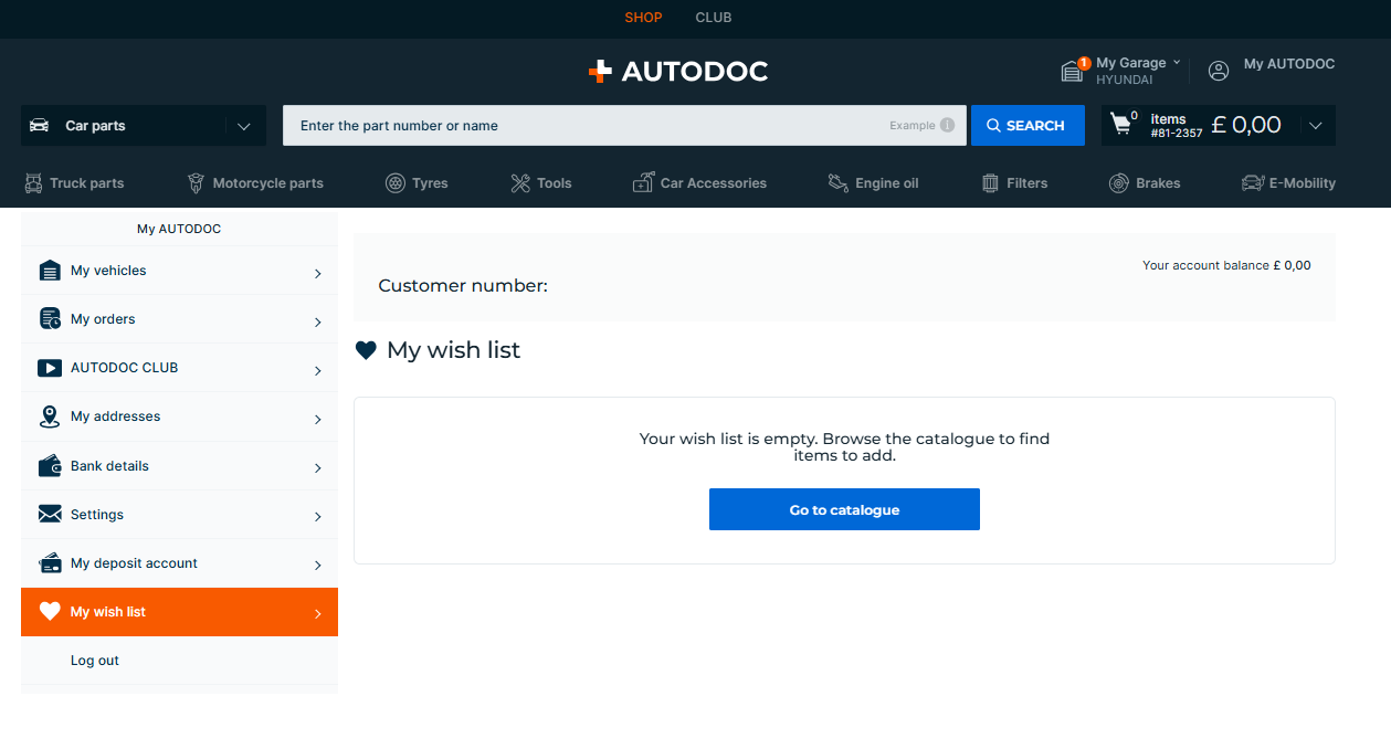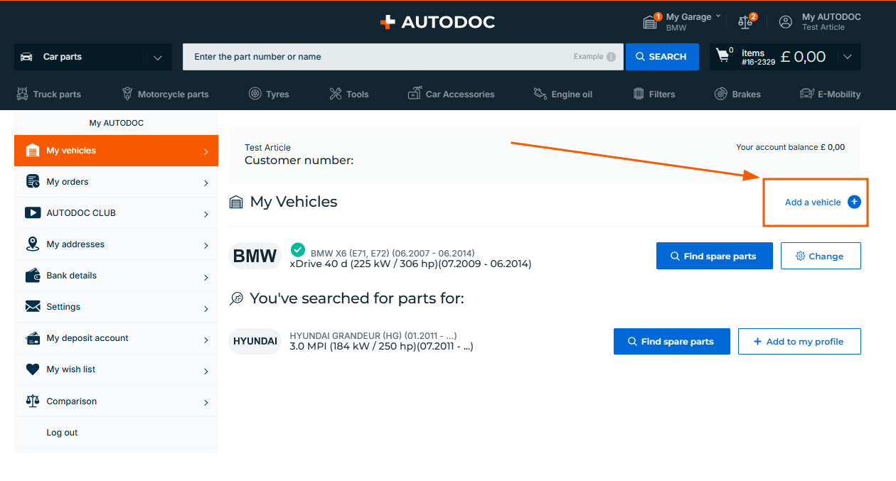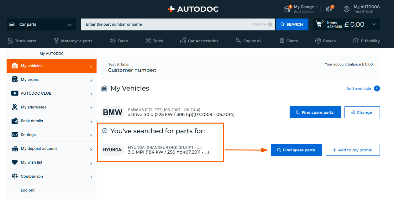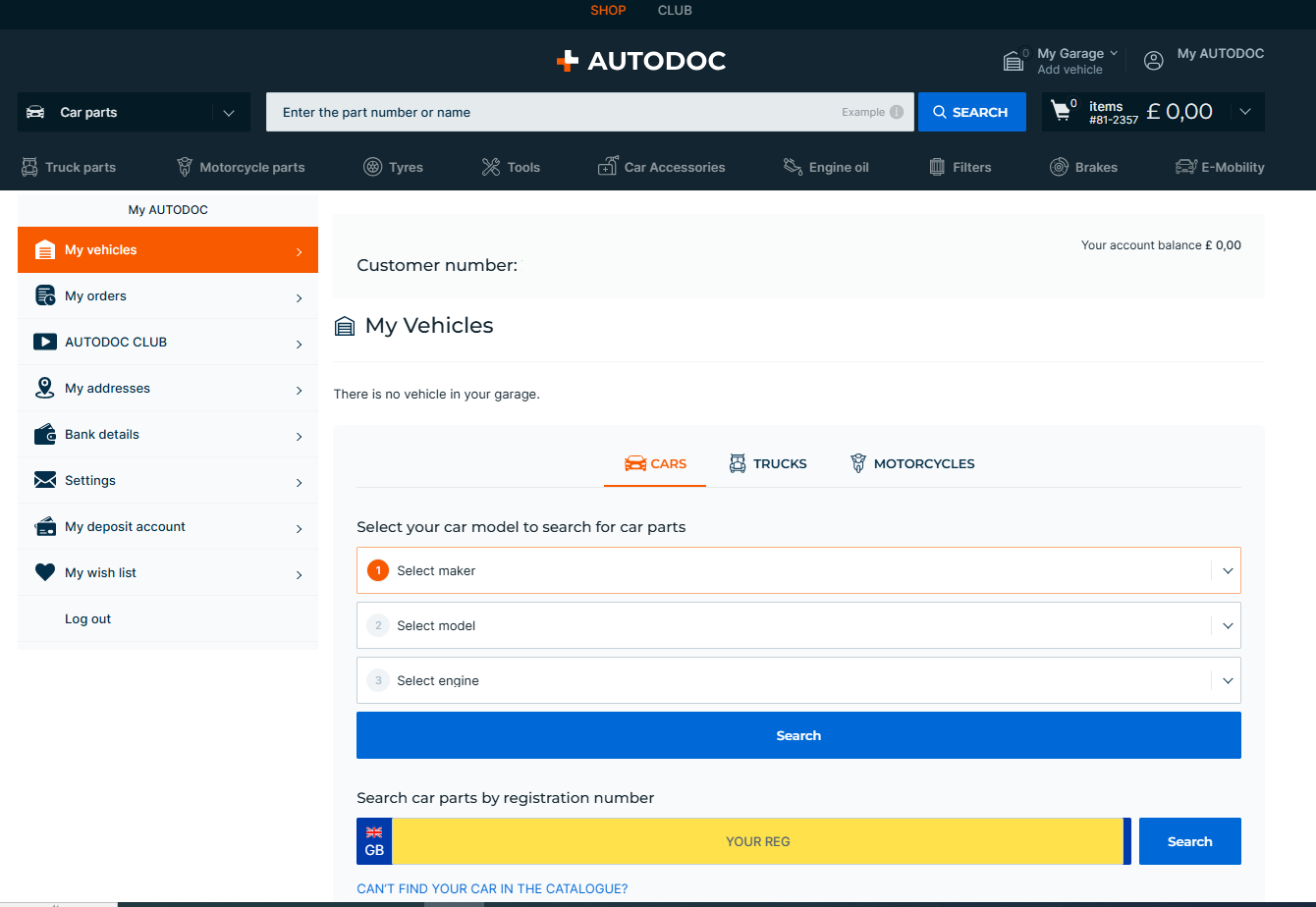 The My vehicles section allows you to quickly go to the spare parts catalogue for the vehicles you have already searched for and purchased parts for in our online shop.