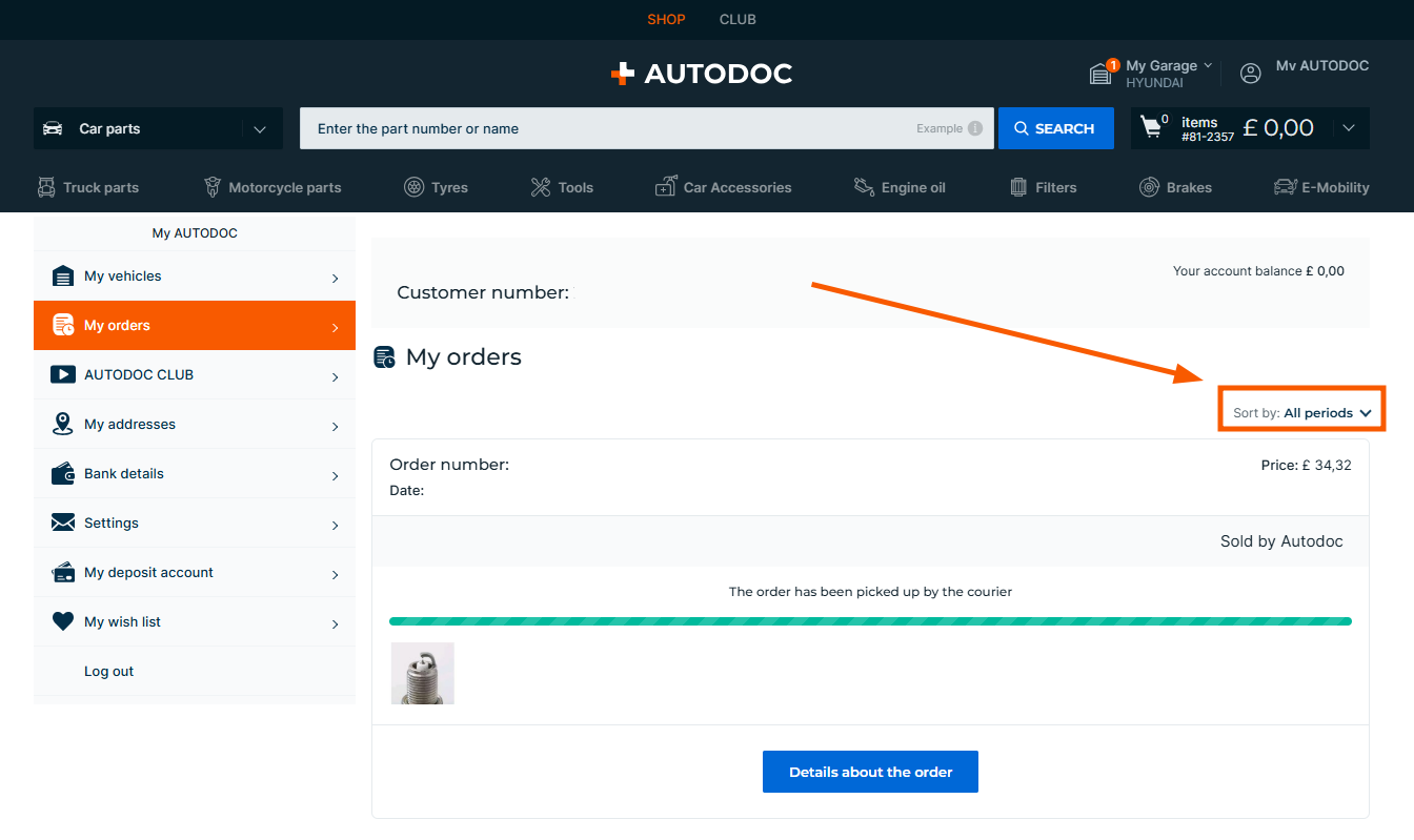 My orders section contains information on all your orders. The orders are listed in reverse chronological order (from the last one to the first one). You can view orders from a specific period by applying the "Sort by" filter.