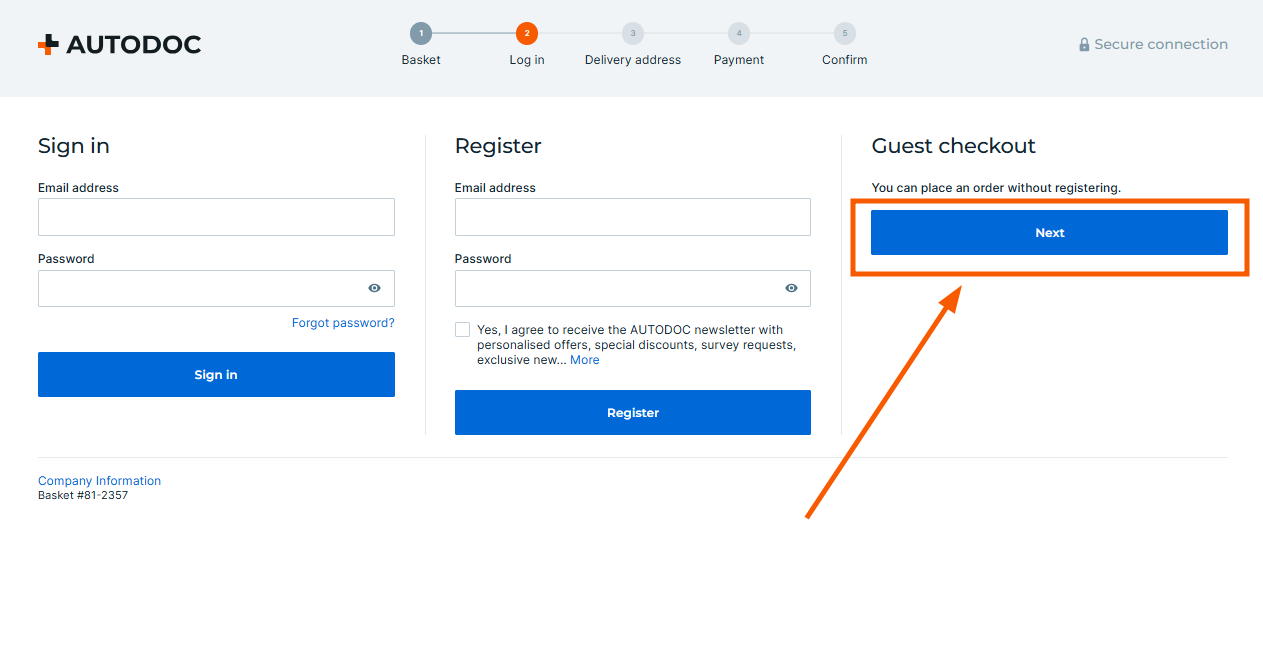 - Place an order as a guest user. At the delivery address stage, click on the Company address checkbox in the basket and fill in the company details correctly.